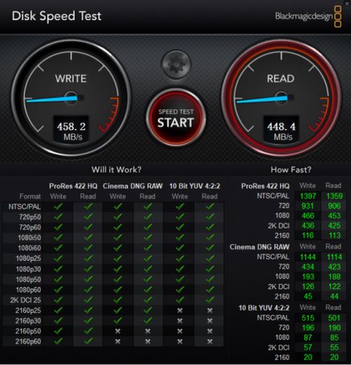根據Disk Speed Test的測試來看,其寫入速度為458.2MB/s,讀取速度為448.4MB/s,與官方給出的數據存在小小差距,不過屬于正常范圍。