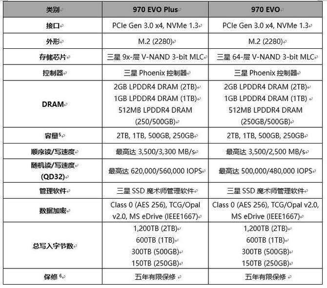 在此,我們整理了這兩款SSD參數(shù)的對(duì)比,從整體來(lái)看,三星970 EVO PLUS采用了全新的閃存,在寫入速度方面得到大幅提升,并且在容量上,也擁有更多的選擇,同時(shí)五年質(zhì)保也能免除用戶的后顧之憂。