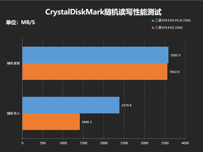 從上面的測(cè)試成績(jī)我們可以看到,在本項(xiàng)目的測(cè)試中,兩款固態(tài)硬盤的順序隨機(jī)讀取成績(jī)接近,沒(méi)有什么太大的差別,均超過(guò)了3500MB/S,而在順序隨機(jī)寫入方面,三星970 EVO PLUS 250G固態(tài)硬盤提升了超過(guò)69%,性能提升非常明顯。