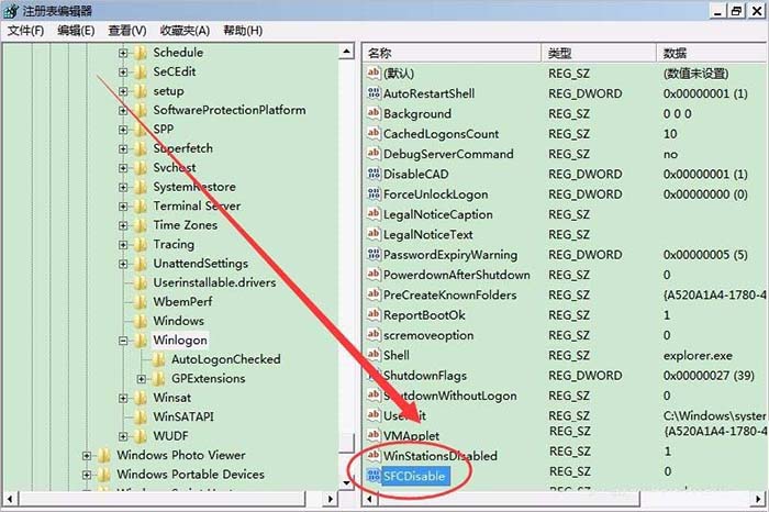 8、依次打開HKEY_LOCAL_MACHINE/SOFTWARE/Microsoft/Windows NT/Current/Version/Winlogon,將 SFCDisable的值修改為0。