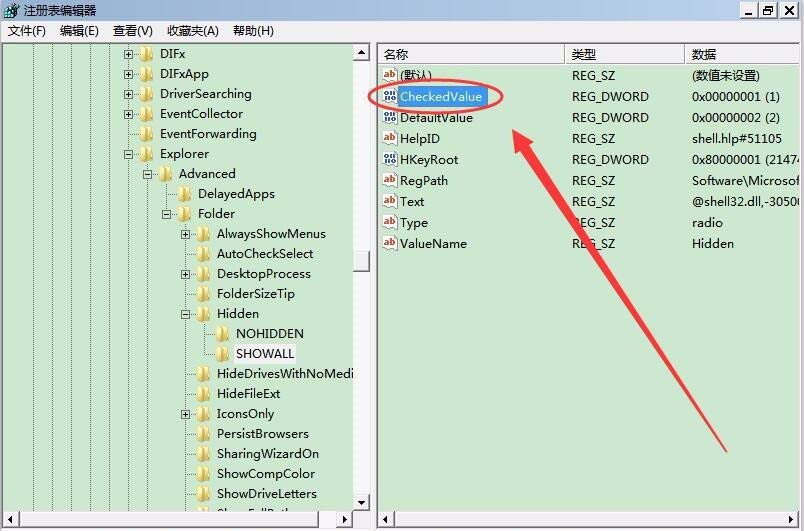 7、注冊(cè)表中依次打開HKEY_LOCAL_MACHINE/SOFTWARE/Microsoft/Windows/CurrentVersion/Explorer/Advanced/Folder/Hidden/SHOWALL,找到CheckedValue項(xiàng),將其值改為1。