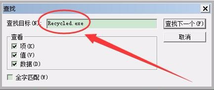 9、在注冊(cè)表中,查找Recycled.exe鍵值,找到后將其Shell鍵刪除。
