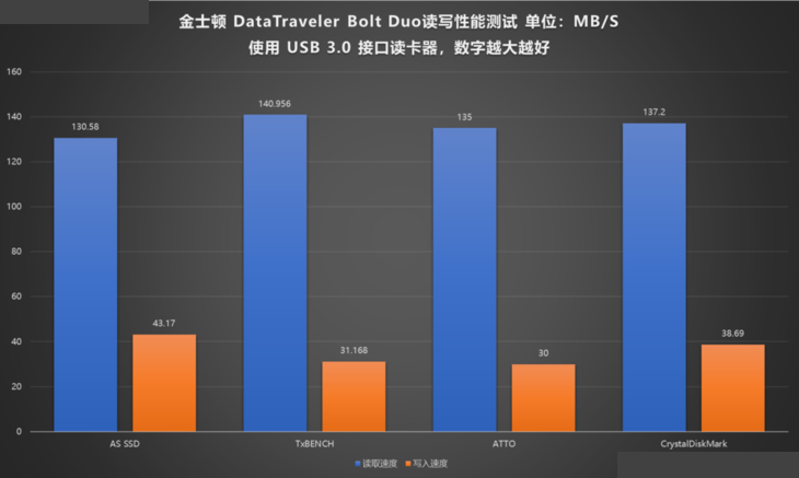 綜上,在四款測試軟件中,金士頓DataTraveler Bolt Duo均有135MB/S左右的讀取速度,寫入速度則保持在35MB/S左右,雖然在重復測試中出現過大數據現象,但取綜合結果。總體來說,金士頓DataTraveler Bolt Duo的成績在閃存盤中算是非常理想。在整個iPhone/iPad雙頭閃存盤中屬于表現前列。