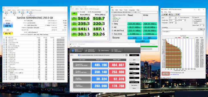 在 CrystalDiskMark 中,閃迪極速移動固態硬盤取得了 562.6MB/s 的讀取速度和 518.7MB/S 的寫入速度,4K 性能同樣非常搶眼。