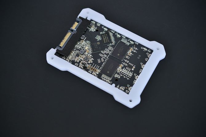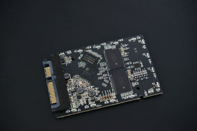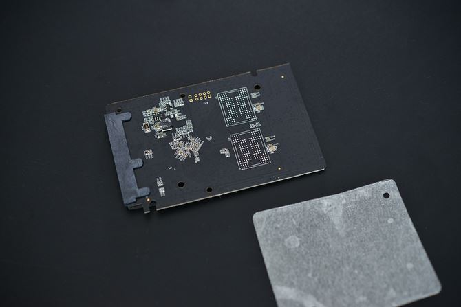 PCB板為2.5寸標準版型,正面有兩顆閃存芯片以及一顆主控芯片和一顆緩存。