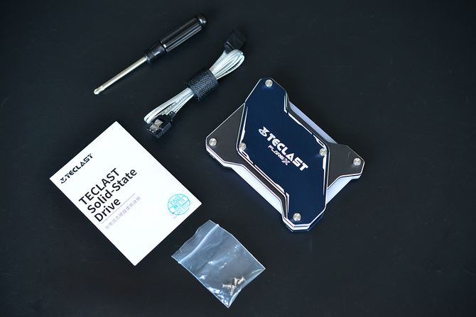 采用了抽拉式禮盒包裝,打開包裝后能看到臺電鋒芒S700 SSD的配件也是非常豐富的,除了SSD主體外,還附贈了一條定制SATA線、螺絲刀,還配有四顆固定螺絲以及產品指南