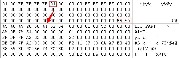 按圖1方式繼續往下找,分別在9號盤和8號盤找到了“55 AA”的標志。9號盤查詢結果如圖3所示。這是一個正常的MBR分區,其0x01C6處數值代表指向的下一個扇區為GPT的頭部。