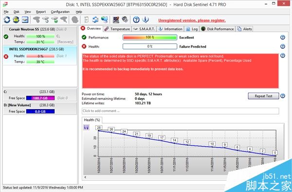 測試是不斷電持續進行高負荷地4KB隨機寫入,算是最傷SSD的行為,最終堅持了50天。