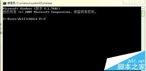 2、在命令提示符窗口中輸入“chkdsk h:/f”(h代表盤,是固態硬盤的盤符。盤符根據實際情況填寫),然后按回車。這個過程根據盤的大小需要的時候不同,耐心等待即可。