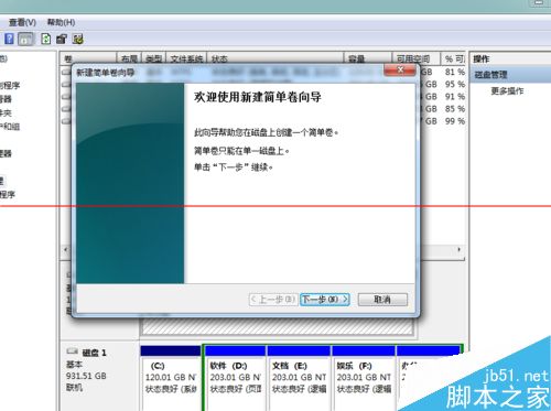 4、進入到新建簡單卷后,其會彈出新建簡單卷向導,點下一步;