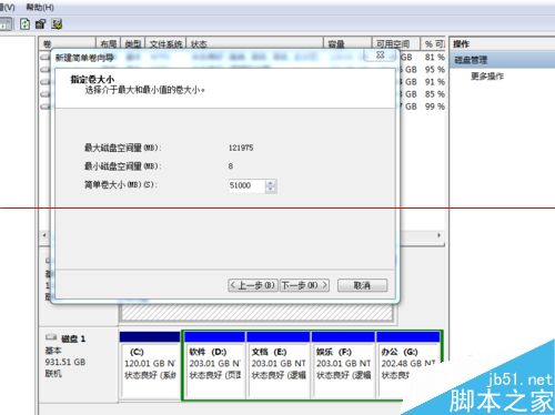5、指定卷大小,此卷大小指的是為要分的固態硬盤配置空間大小;根據自己電腦的實際情況設置大小即可;