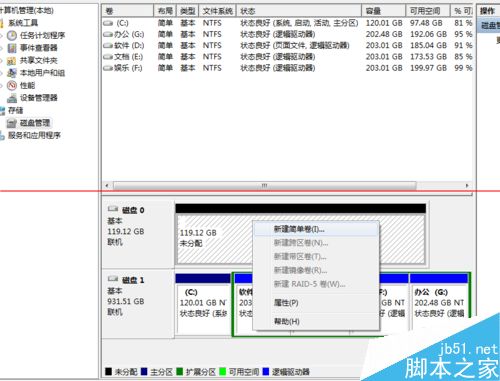 3、在彈出的磁盤管理器中,可以查看到剛安裝的固態盤,此時的固態盤還是為不可用狀態;(直接打開我的電腦,是沒有固態盤顯示的)在未分配的固態盤上右鍵,彈出新建簡單卷;