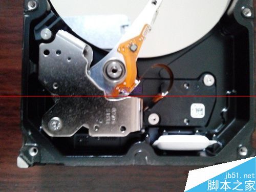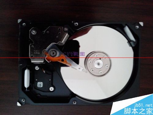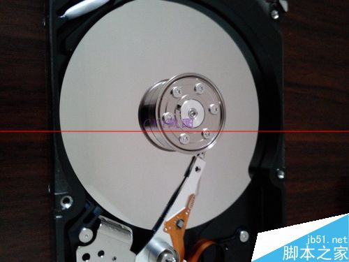 1、揭開上蓋,發(fā)現(xiàn)一個一塵不染的圓盤,比照鏡子還清晰,這就是磁盤。硬盤中的信息都是保存在它的上面。長條型的就是磁頭組件,通過它對數(shù)據(jù)進行讀取、存儲。硬盤后部的金屬,是一塊磁鐵,用它控制磁頭進行左右移動。