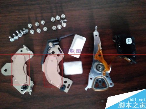 3、圖中就是硬盤拆卸后的散件。紅框中的是磁鐵,磁性很強,兩塊合到一起,用手掰不開,剛合上時的力量能夾疼手指。白色的小塊是空氣過濾片。這些散件加上一個外殼、一個磁盤、一個電機、一個電路板,就組成了我們使用的硬盤。