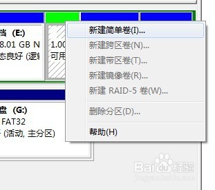 3、右鍵綠色的可用分區(qū),點(diǎn)右鍵菜單里的”新建簡(jiǎn)單卷“,