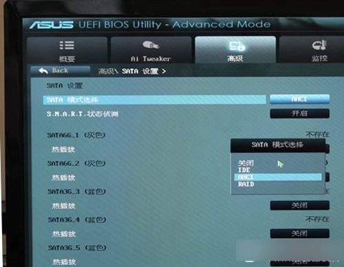 進入主板BIOS設置界面后,然后在Advanced(高級)選項中,找到SATA接口模式設置的界面,之后可以看到SATA模式有IDE、AHCI、RAID三種,選擇AHCI模式,然后按F10保存退出即可,如下圖所示。