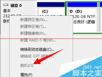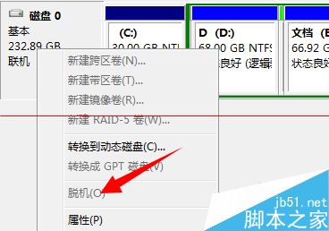 5、右鍵點(diǎn)擊左下方磁盤列表中的,磁盤名,在彈出菜單點(diǎn)擊【脫機(jī)】(如下圖)