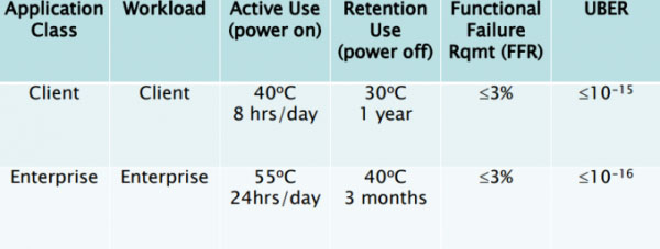 在回答前面有關(guān)SSD數(shù)據(jù)保留問題之前,我們先來了解下廠商是如何確定SSD可靠率的。首先,SSD必須保證一定的容量,因此不可能把很多區(qū)塊(blocks)用于OP空間之類,這樣做會降低用戶的可用容量(SSD的這個特點(diǎn)可以參考我們之前的文章解釋)。第二,SSD必須達(dá)到規(guī)定的UBER及FFR指標(biāo),下面的表格解釋了UBER和FFR的含義,前者是SSD讀取字節(jié)中出錯的字節(jié)比例,F(xiàn)FR則是功能失效的比例,消費(fèi)級及企業(yè)級SSD在這兩個指標(biāo)上有不同的要求,消費(fèi)級SSD的UBER是10-15,也就是1/1015的字節(jié)讀取失敗率,F(xiàn)FR不能高于3%。