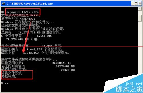 3、在命令窗口按照convert命令的格式輸入:convert I:/fs:ntfs,回車開始對磁盤I進行格式轉換。其中I:表示要轉換的磁盤盤符。fs為filesystem文件系統的縮寫。命令運行完成,提示轉換成功。