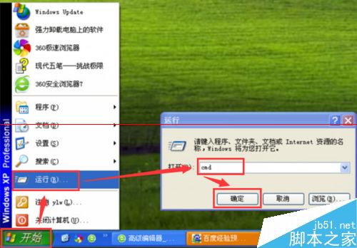 2、依次點擊:開始菜單——運行,在運行對話框中輸入:cmd,回車打開CMD命令窗口。