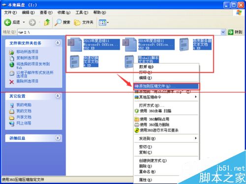 1、如果磁盤上沒有文件或文件較少,可以先將文件備份到其它盤,然后通過格式化來將磁盤格式進行轉換。備份可以直接通過復制、粘貼來實現。這里我們用壓縮軟件來備份文件。首先,全選I盤上需要備份的文件,右鍵”添加到壓縮文件”。