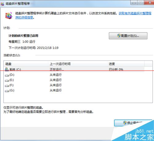3、進入碎片整理界面,點擊右下角的磁盤碎片整理開始整理我們的磁盤隨便(整理過程可能會很長,耐心等待。)