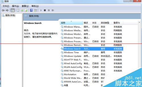2、然后在右方的服務列表中找到Windows Search(索引服務便于我們在電腦上搜索文件時的效率,其實沒用)服務,