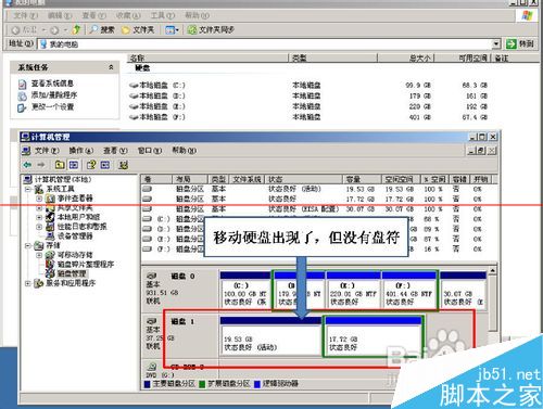 2、這個(gè)時(shí)候,我們可以右鍵點(diǎn)擊“我的電腦”,選擇“管理”,從彈出的對話框里面選擇“存儲-》磁盤管理”來查找我們的移動硬盤,會發(fā)現(xiàn)我們剛插入的移動硬盤出現(xiàn)在里面,但沒有盤符。