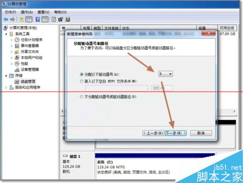 6、為這個(gè)分區(qū)指定盤號(hào),如有C盤了,系統(tǒng)會(huì)按順序默認(rèn)指定為D盤。也可以手工指定,設(shè)定完成,點(diǎn)擊:“下一步”。
