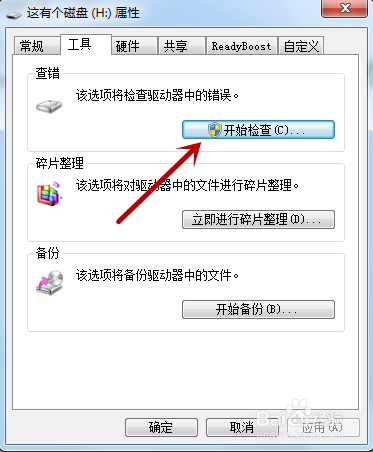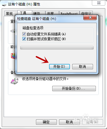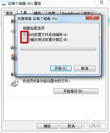5、勾選磁盤檢查選項下的“自動修復(fù)文件系統(tǒng)錯誤”“掃描并試圖回復(fù)壞扇區(qū)”選項。