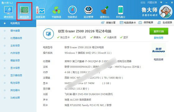 1、在電腦中下載安裝“魯大師”軟件,安裝后,直接打開,之后切換到【硬件檢測】選項,這里可以看到電腦硬件的完整配置信息,如下圖所示。