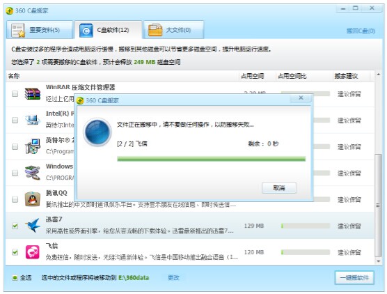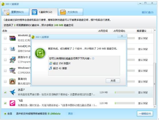 搬家的過程很快,一般的軟件只要幾秒種就能搞定。搬家完成后,360C盤搬家還會提示釋放磁盤空間量。