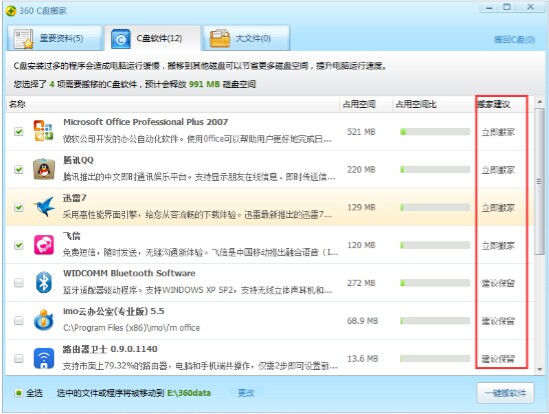 圖4:360 C盤搬家獨家建議“立即搬家”還是“保留”