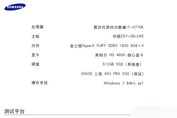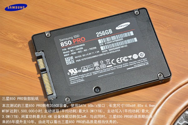 本次測(cè)試的三星850 PRO擁有256GB容量,使用SATA 6Gb/s接口 ,長(zhǎng)寬尺寸100x69.85x 6.8mm MTBF達(dá)到1,500,000小時(shí),主動(dòng)讀取(平均功耗)最大3.3W(1TB),主動(dòng)寫入(平均功耗)最大3.0W(1TB),閑置功耗最大0.4W,設(shè)備休眠功耗僅2mW。與此同時(shí),三星850 PRO的保質(zhì)期由原來的5年提升至10年,由此可以看出三星850 PRO的品質(zhì)是相當(dāng)優(yōu)秀的。