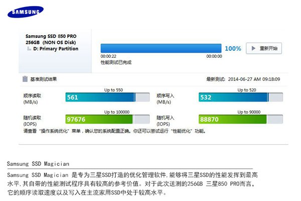 Samsung SSD Magician是專為三星SSD打造的優(yōu)化管理軟件,能夠?qū)⑷荢SD的性能發(fā)揮到最高水平,其自帶的性能測(cè)試程序具有較高的參考價(jià)值。對(duì)于此次送測(cè)的256GB 三星850 PRO而言,它的順序讀取速度以及寫入在主流家用SSD中處于較高水平。速度在主流家用SSD中處于較高水平。