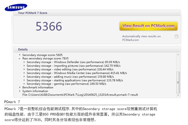 PCmark 7是一款整機(jī)綜合性能測(cè)試程序,其中的Secondary storage score項(xiàng)側(cè)重測(cè)試計(jì)算機(jī)的磁盤性能。由于三星850 PRO在QD1性能方面的提升非常顯著,所以其Secondary storage score得分達(dá)到了7835,同時(shí)其各分項(xiàng)表現(xiàn)也非常理想。