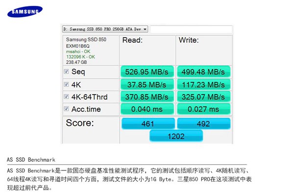 AS SSD Benchmark是一款固態(tài)硬盤基準(zhǔn)性能測(cè)試程序,它的測(cè)試包括順序讀寫、4K隨機(jī)讀寫、64線程4K讀寫和尋道時(shí)間四個(gè)方面,測(cè)試文件的大小為1G Byte。三星850 PRO在這項(xiàng)測(cè)試中表現(xiàn)超過前代產(chǎn)品。