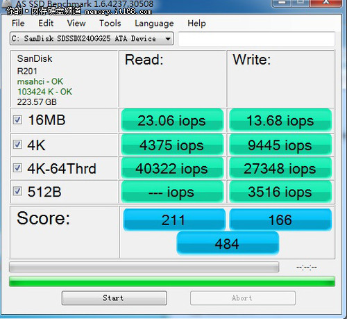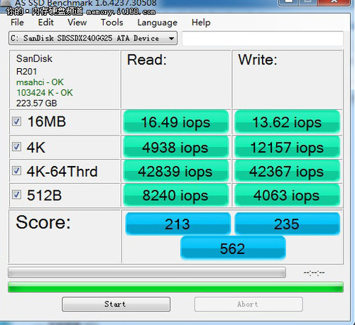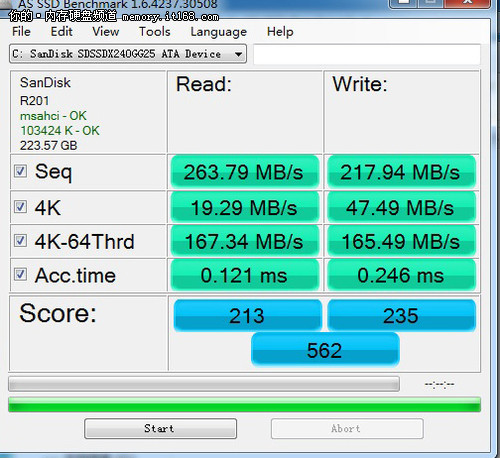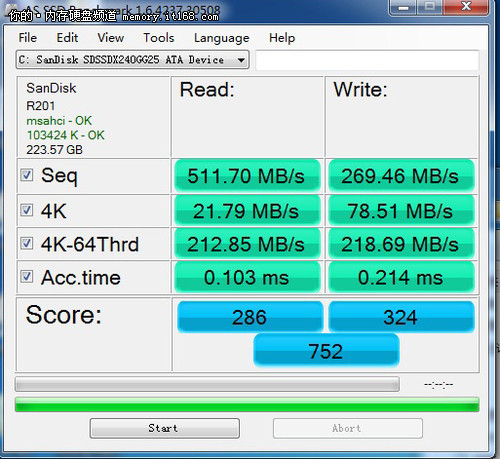 在AS SSD測試中,閃迪至尊極速系列240GB固態(tài)硬盤運用原生SATA3.0接口在連續(xù)讀取和寫入方面達到了511.70MB/s和269.46MB/s。它的4K多線程讀取速度為212.85MB/秒,寫入速度為218.69MB/秒。而單單順序讀取方面原生SATA3.0接口就比SATA2.0接口方面多了近一倍。