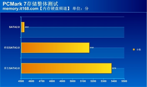 PCMark跑分中,閃迪至尊極速系列240GB固態(tài)硬盤在Intel i7-3770k加上華碩M5F主板的平臺上作為從盤,在原生SATA3.0接口下為5376,橋接SATA3.0接口下為5161,而SATA2.0接口下僅為4531。相差700多分,這在整體存儲跑分下,性能方面的差距表現(xiàn)異常明顯。