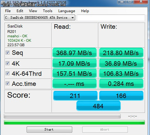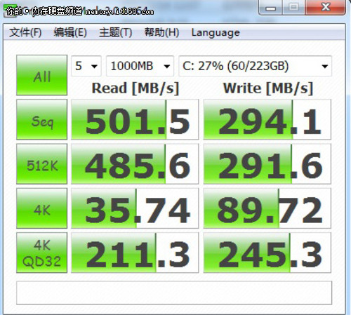 從CrystalDiskMark測試看接口不同造成的速度影響也同樣比較明顯,閃迪至尊極速系列240GB固態(tài)硬盤運用原生SATA3.0接口測試的讀取速度達到501.5MB/s,而寫入速度也達到294.1MB/s。4K QD32深度的讀取速度為211.1MB/s,寫入為245.3MB/s。而SATA2.0接口下的測試讀取速度最大僅為269MB/s(采用峰值數(shù)據(jù)),可見速度在接口上的局限性對于整個固態(tài)硬盤的性能影響有多大。
