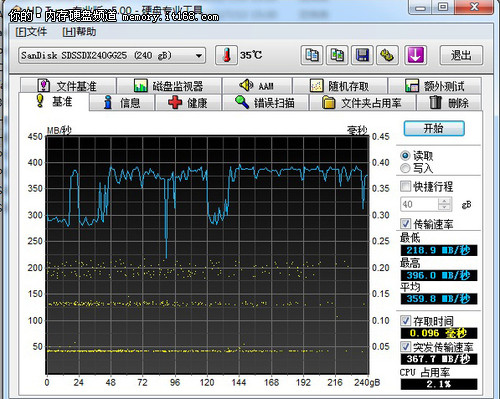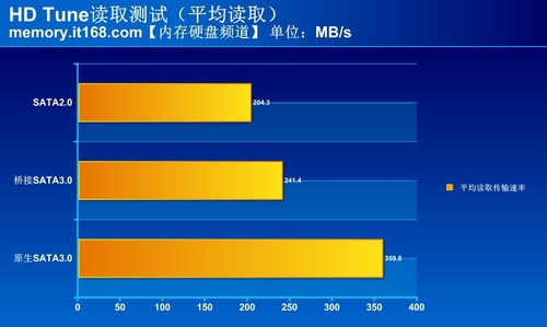 在HD Tune底層測試固態(tài)硬盤中,我們主要參考的是其測試出來的平均讀取傳輸速度,原生SATA3.0接口、橋接SATA3.0接口和SATA2.0接口平均讀取傳輸速度分別是359.8MB/s、241.6MB/s和204.3MB/s。