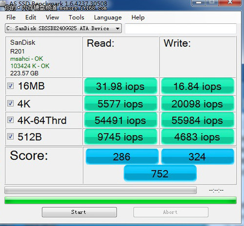 在4KB文件存取方面,閃迪至尊極速系列240GB固態(tài)硬盤運用原生SATA3.0接口的隨機讀取IOPS值為5577,而隨機寫入為20098。其多線程讀取/寫入4KB文件的IOPS值為54491和55984,總分為752分。雖然這里的跑分,在有些數(shù)據(jù)方面SATA2.0比橋接SATA3.0方面要高,但是不可否認的是使用原生SATA3.0固態(tài)硬盤的性能提升特別明顯。