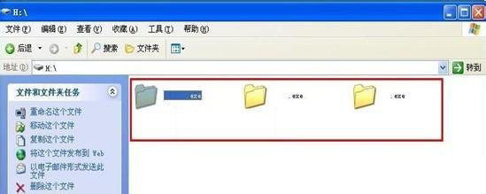 4.現在再看看你的U盤,是不是發現了很多EXE文件或者autorun.inf文件?←你看到兩個一樣的文件夾?那么有一個是病毒,右鍵菜單不是“打開,搜索,資源管理器”之類的是病毒。