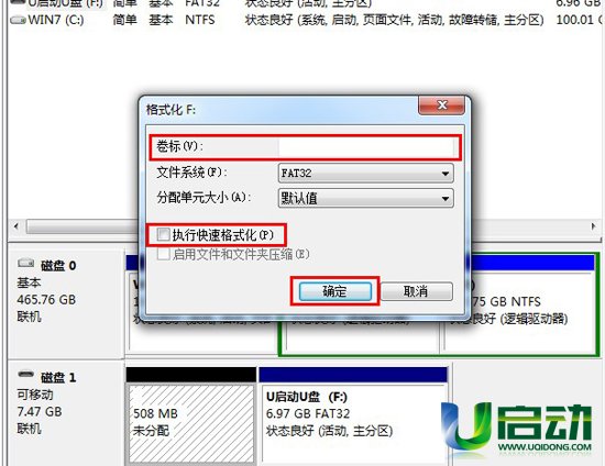 2、右鍵點擊u盤,在右邊的窗口下點擊“格式化”后在他不出的窗口中點擊“是”按鈕就會彈出“格式化F:”的提示窗口,我們將“卷標”處顯示的“新加卷”三個字刪除,“執行快速格式化(P)”前的勾刪除后點擊“確認”按鈕即可;如下圖所示: