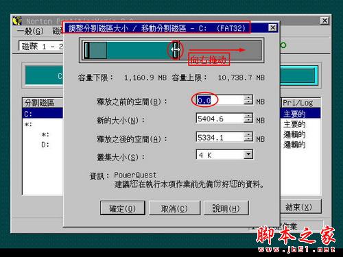 這里一定要釋放D盤頭部的空間,因?yàn)镃盤和D盤是相連的,這樣釋放出來(lái)的空間就可以直接分配給C盤。如果是釋放D盤的尾部空間,因C盤尾部與D盤尾部不相連而導(dǎo)致釋放出來(lái)的空間無(wú)法分配給C盤。這一點(diǎn)尤為重要。這一部操作完之后,點(diǎn)擊“確定”按鈕來(lái)保存剛才的操作。
