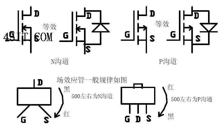 把數字萬用表打到二極管檔,用兩表筆任意觸碰場效應管的三只引腳,好的場效應管最終測量結果只有一次有讀數,并且在500左右。如果在最終測量結果中測得只有一次有讀數,并且為“0”時,須用表筆短接場效應管三只引腳,然后再測量一次,若又測得一組為500左右讀數時,此管也為好管。不符合以上規律的場效應管均為壞管。