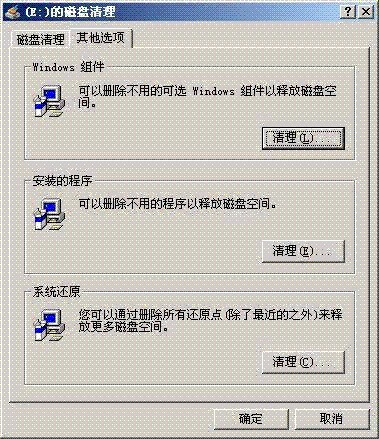 在磁盤清理程序中,除了上面介紹的清理方法外,還有其他可選項,用戶可以單擊“其他選項”選項卡,在該選項卡中共有三個可選項。如圖4所示。第一個用于清理系統組件,如果用戶覺得安裝某些系統組件是多余,那么就可以選擇該選項以釋放更多硬盤空間,單擊“清理”按鈕后將彈出Windows XP組件向導對話框。第二個用于刪除用戶安裝的軟件程序,單擊“清理”按鈕后將彈出Windows XP下的添加/刪除程序對話框。