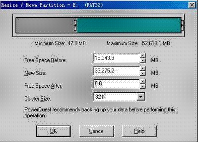 注意:PQ在調整一個分區容量時,既可騰出分區的前面部分,也可騰出后面部分,或者兩頭都騰出一部分空間來。不過現在是希望將E盤的空間騰給D盤,因此只有前面騰出來的空間D盤才能接收。而如果是想將E盤的空間給后面的F盤,則應該騰出E盤后面的空間。