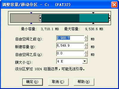 例如C盤容量為10GB,我們只需將這個自由空間調整為3GB左右就可以了,此時,C盤的容量就變為7GB了。在這個過程中,建議將屏蔽的空間選擇稍大一點,而不用斤斤計較丟失的容量,以免仍然將壞道劃分在C盤的空間里。畢竟現在的硬盤動輒80GB到120GB,丟失這區區幾個G的容量但是就可以挽救一個硬盤還是值得的。