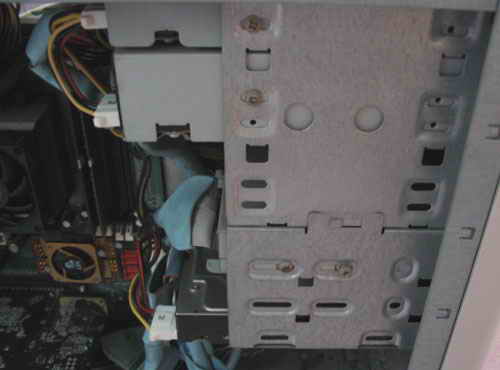 三、打開機箱后,將硬盤放回到原來的位置。咱們發現主機配置的磁盤設備有不少,包括一個DVD刻錄機,一個CD-ROM,一個硬盤,一個軟驅。其中前面三個設置都是IDE接口產品,二條IDE連線和一條軟驅線,占據了不少空間,同時也明顯影響機箱內部的熱量流通,進一步使得主機運行時內部溫度上升。